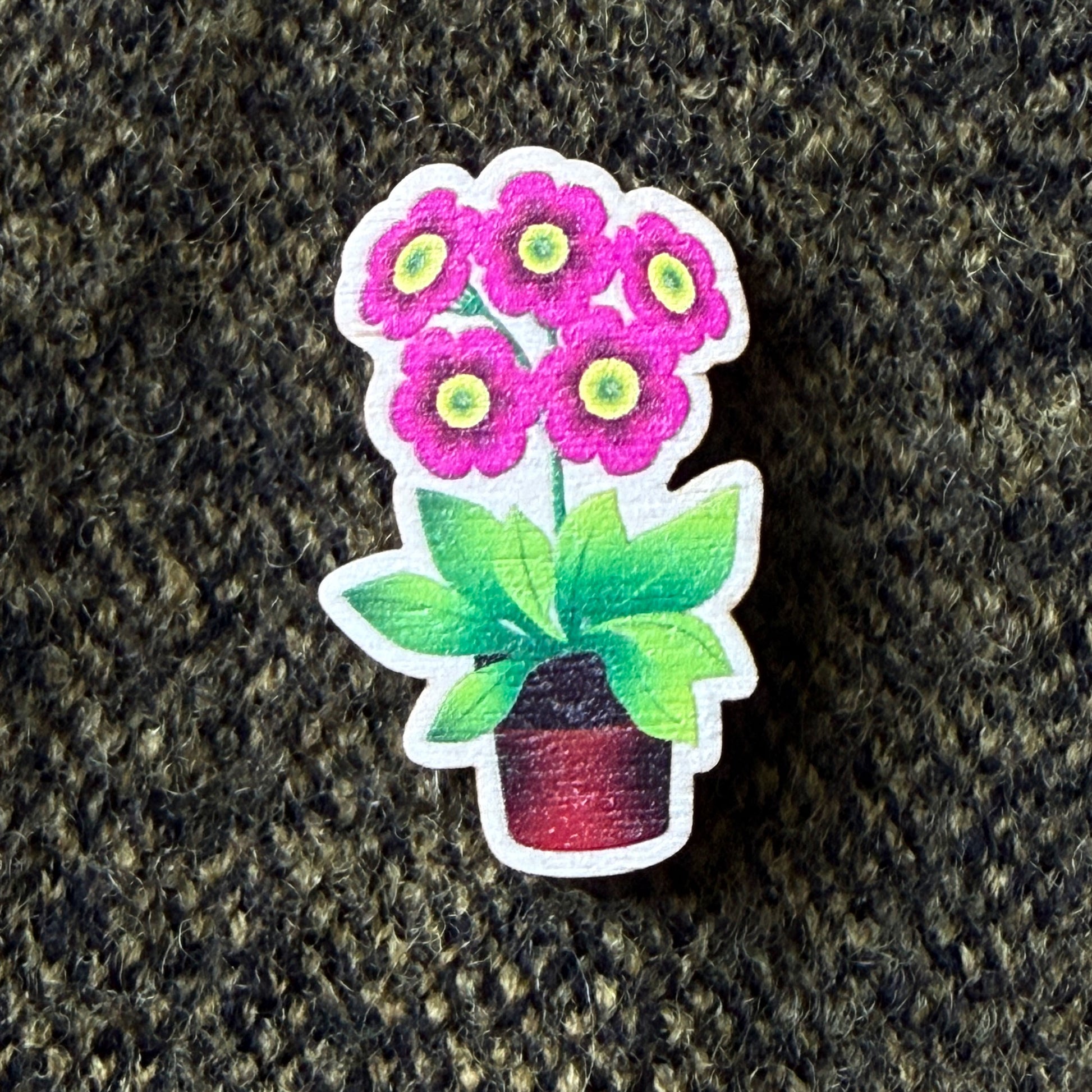 Pin brooch with my "Auricula" illustration printed onto wood, measuring 2.5cm in width, and 4.4cm height. There is a pin clasp on the back.