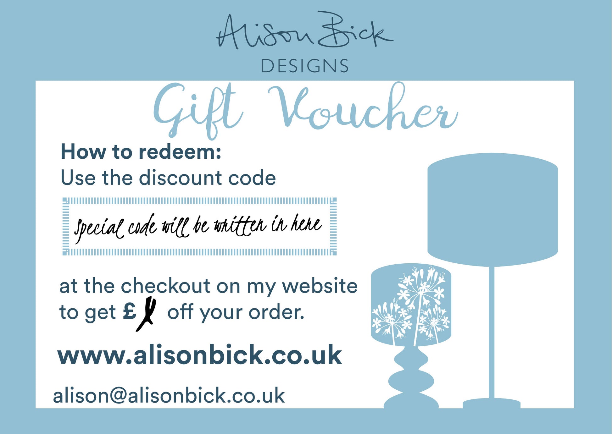 A £55 voucher will be perfect for a 20cm diameter Lampshade, £65 for a 30cm diameter Lampshade, and £85 for a 40cm diameter lampshade.